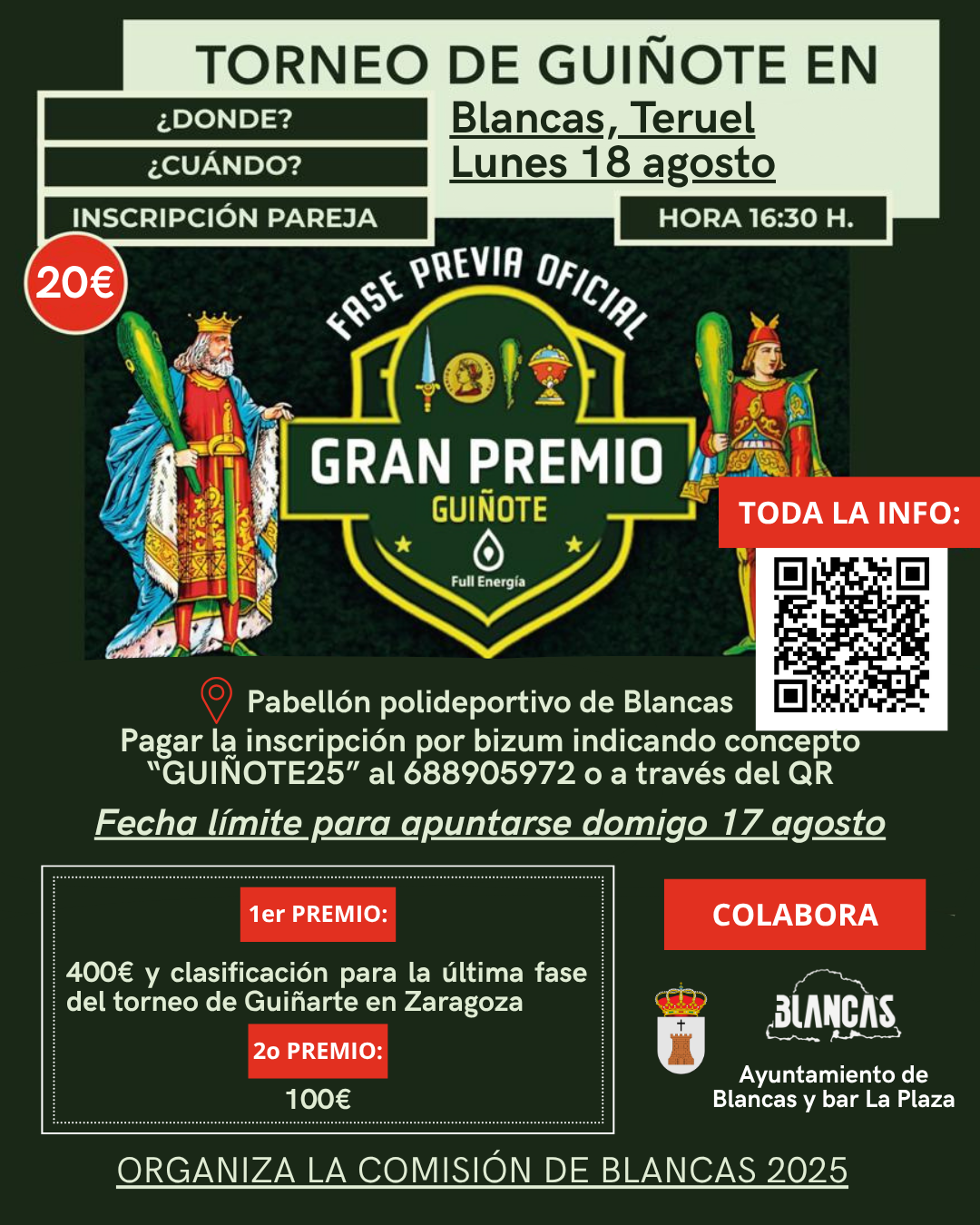 Primer Clasificado: Trofeo, 400€ en metálico y un pase directo a la Gran Final de GUIÑARTE en ZARAGOZA.